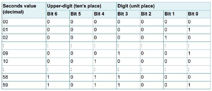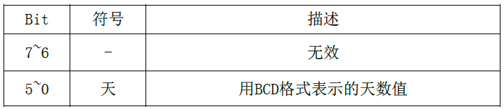 秒、分钟、小时、日、月、年、分钟报警、小时报警、日报警寄存器中的数据编码格式为BCD,只有星期和星期报警寄存器中的数据不以BCD格式编码。BCD码(Binary-Coded Decimal)是一种二进制的数字编码形式,用四个二进制位来表示一位十进制数(0~9),能够使二进制和十进制之间的转换得以快捷的进行。
