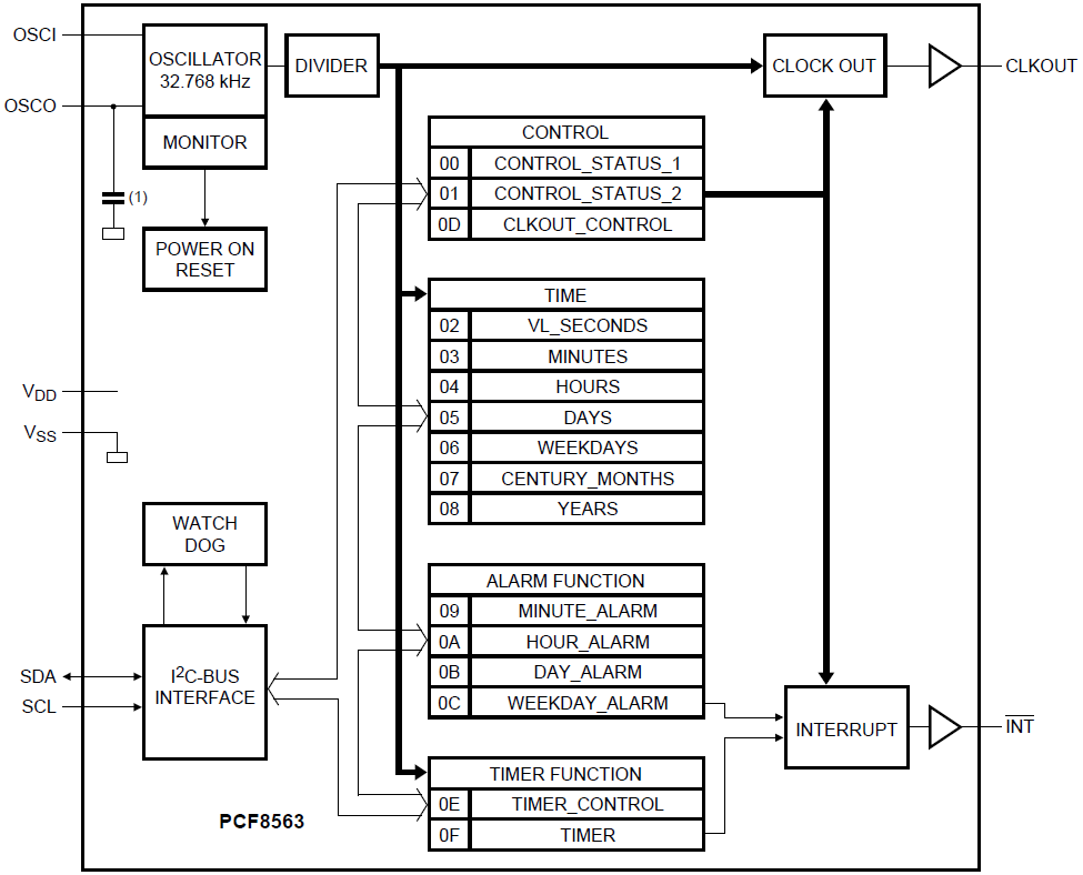 PCF8563是PHILIPS公司推出的一款工业级多功能时钟/日历芯片,具有报警功能、定时器功能、时钟输出功能以及中断输出功能,能完成各种复杂的定时服务。其内部功能模块的框图如下图所示:
