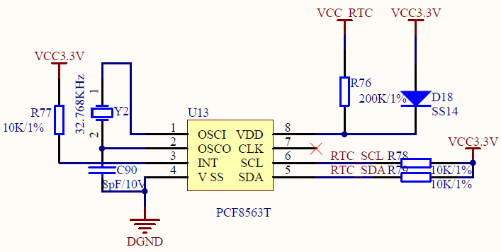PCF8563作为I2C接口的从器件挂接在开发板上的IIC总线上。 OSCI、OSCO与外部32.768KHz的晶振相连,为芯片提供驱动时钟;RTC_SCL和RTC_SDA分别是I2C总线的串行时钟接口和串行数据接口。