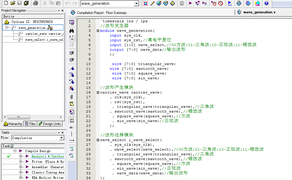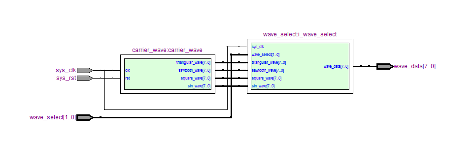 `timescale?1ns?/?1ps //波演示视频形发生器 module?wave_generation( ????input?sys_clk, ????input?sys_rst,//高电平复位 ????input?[1:0]?wave_select,//00方波;01-三角波;10-正弦波;11-锯齿波 ????output?[7:0]?wave_data//输出波形 ????); ?wire?[7:0]?triangular_wave; ????wire?[7:0]?sawtooth_wave; ?wire?[7:0]?square_wave; ?wire?[7:0]?sin_wave; //波形产生模块? carrier_wave?carrier_wave( ????.?clk(sys_clk), ????.?rst(sys_rst), ?.?triangular_wave(triangular_wave),//三角波 ????.?sawtooth_wave(sawtooth_wave),//锯齿波 ?.?square_wave(square_wave),//方波 ?.?sin_wave(sin_wave)//正弦波 ????); //波形选择模块 wave_select?i_wave_select( ????.?sys_clk(sys_clk), ????.?wave_select(wave_select),//00方波;01-三角波;10-正弦波;11-锯齿波
