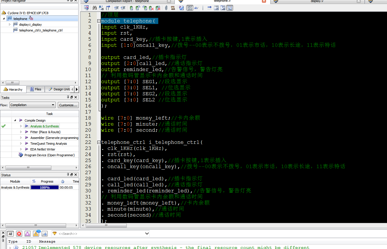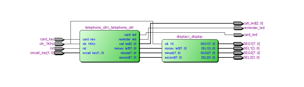 //顶层 module?telephone( input?clk_1KHz, input?rst, input?card_key,//插卡按键,1表示插入 input?[1:0]oncall_key,//拨号--00表示不拨号,01表示市话,10表示长途,11表示特话 output?card_led,//插卡指示灯 output?[2:0]call_led,//通话指示灯 output?reminder_led,//告警信号,警告灯亮 //?利用数码管显示卡内余额和通话时间 output?[7:0]?SEG1,//段选显示 output?[3:0]?SEL1,?//位选显示 output?[7:0]?SEG2,//段选显示 output?[3:0]?SEL2?//位选显示 ); wire?[7:0]?money_left;//卡内余额 wire?[7:0]?minute;//通话时间 wire?[7:0]?second;//通话时间 telephone_ctrl?i_telephone_ctrl( .?clk_1KHz(clk_1KHz), .?rst(rst), .?card_key(card_key),//插卡按键,1表示插入 .?oncall_key(oncall_key),//拨号--00表示不拨号,01表示市话,10表示长途,11表示特话 .?card_led(card_led),//插卡指示灯 .?call_led(call_led),//通话指示灯 .?reminder_led(reminder_led),//告警信号,警告灯亮 //?利用数码管显示卡内余额和通话时间 .?money_left(money_left),//卡内余额 .?minute(minute),//通话时间 .?second(second)//通话时间 ); //数码管显示模块 display?i_display( .?clk_1K(clk_1KHz), //?利用数码管显示卡内余额和通话时间 .?money_left(money_left),//卡内余额 .?minute(minute),//通话时间 .?second(second),//通话时间 .?SEG1(SEG1),//段选显示 .?SEL1(SEL1),?//位选显示 .?SEG2(SEG2),//段选显示 .?SEL2(SEL2)?//位选显示 );