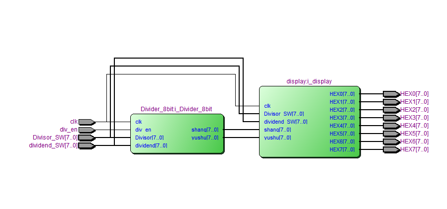 //除法模块 module?Divider_8bit( input?clk,//时钟 input?div_en,//开始计算信号,为低电平开始 input?[7:0]?Divisor,//被除数?,Divisor/dividend input?[7:0]?dividend,//除数 output?[7:0]?shang,//商 output?[7:0]?yushu//余数 ); wire?[15:0]?Divisor_extend;//扩展为16位 assign?Divisor_extend={8'b00000000,Divisor}; parameter?state_idle?=3'd0;//空闲状态 parameter?state_load?=?3'd1;//加载被除数 parameter?state_leftshift?=?3'd2;//左移 parameter?state_judge?=?3'd3;//判断高位是否大于除数 parameter?state_sub?=?3'd4;//减去 parameter?state_end?=?3'd5;//结束 reg?[2:0]?state=3'd0; reg?[15:0]?data=16'd0; reg?[2:0]?shift_cnt=3'd0;//移位次数累计 reg?[7:0]?shang_reg=8'd0;//商 reg?[7:0]?yushu_reg=8'd0;//余数 always@(posedge?clk) case(state) state_idle:begin shift_cnt<=3'd0; if(div_en==0)//加载被除数 state<=state_load; else state<=state_idle; end state_load:begin data<=Divisor_extend;//加载被除数 state<=state_leftshift; shift_cnt<=3'd0; end