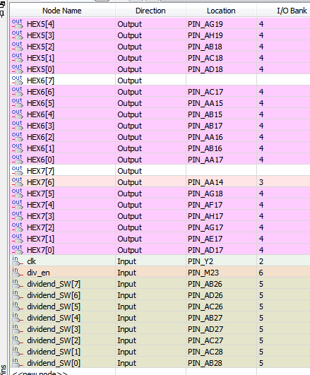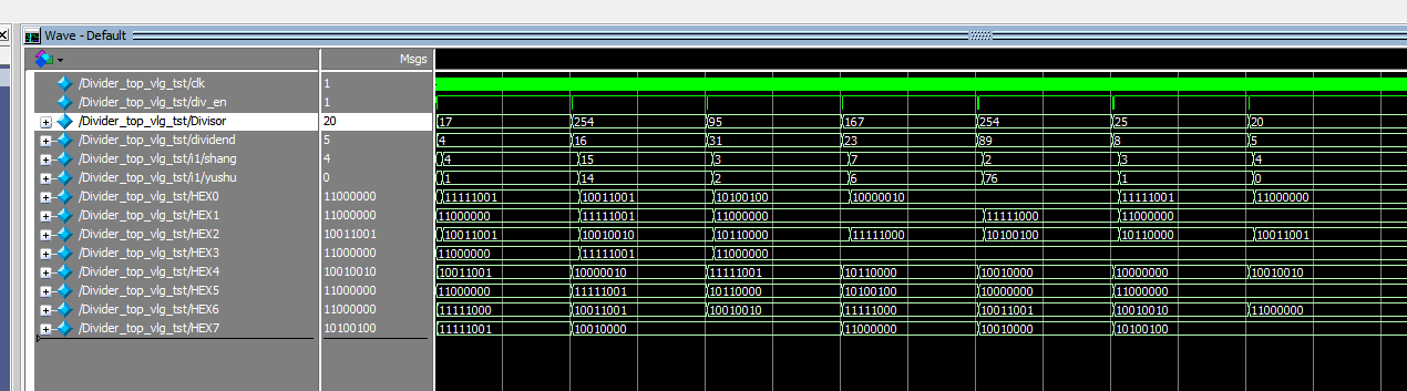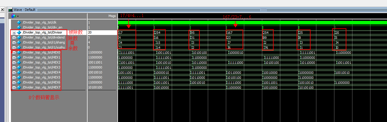 要求实现两个无符号二进制除法运算,并在七段数码管上进行显示。显示顺序依次是:(1)最高两个数码管显示被除数;(2)次高两个数码管显示除数;(3)次低两个数码管显示商;(4)最低两个数码管显示余数。要求使用移位和相减的方法实现。