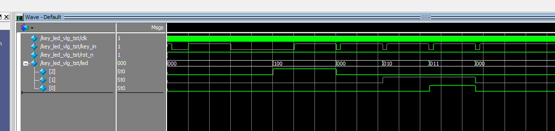//长按一秒按钮第一个led亮,再按一下(无论按多久)熄灭, //再按一下第二个亮起,再按一下第三个亮,再按一下复原 module?key_led( input?clk,//时钟 input?key_in,//按键 output?[2:0]?led//输出led ); parameter?second_1=32'd50000000;//1秒计数参数(下载到板子上用该句) //parameter?second_1=32'd500;//1秒计数参数(减小计数值,加快仿真时间,软件仿真用该句) reg?[3:0]?cur_state,next_state; //状态定义 parameter?s_idle=4'd0; parameter?s_wait=4'd1; parameter?s_led1_on=4'd2; parameter?s_led1_off=4'd3; parameter?s_led2_off=4'd4; parameter?s_led2_on=4'd5; parameter?s_led3_off=4'd6; parameter?s_led3_on=4'd7; parameter?s_led1_wait=4'd8; parameter?s_end=4'd9; reg?[31:0]?count=32'd0; //状态机第一段 always@(posedge?clk) cur_state<=next_state; always@(*) case(cur_state) s_idle: if(key_in==0)//按键按下 next_state=s_wait; else next_state=s_idle; s_wait://等待1秒 if(count>=second_1)//1秒 next_state=s_led1_on; else?if(key_in==1)//按键释放 next_state=s_idle;//回到初始状态 else next_state=s_wait; s_led1_on://第一个led亮 if(key_in==1)//按键释放 next_state=s_led1_wait; else? next_state=s_led1_on; s_led1_wait: if(key_in==0)//按键按下 next_state=s_led1_off; else next_state=s_led1_wait; s_led1_off: if(key_in==1)//按键释放 next_state=s_led2_off; else? next_state=s_led1_off; s_led2_off: if(key_in==0)//按键按下 next_state=s_led2_on; else next_state=s_led2_off; s_led2_on://第2个led亮 if(key_in==1)//按键释放 next_state=s_led3_off; else next_state=s_led2_on; s_led3_off: if(key_in==0)//按键按下 next_state=s_led3_on; else next_state=s_led3_off; s_led3_on://第3个led亮 if(key_in==1)//按键释放 next_state=s_end; else next_state=s_led3_on; s_end: if(key_in==0)//按键按下 next_state=s_idle; else next_state=s_end; default:next_state=s_idle; endcase