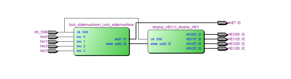 module?digital_lock_DE1( input?clk_50M,//50MHz input?key0,//按键0 input?key1,//按键1 input?key2,//按键2 input?key3,//按键3 output?[7:0]?led,//LED指示输入多少位数 output?[6:0]HEX0,//数码管 output?[6:0]HEX1,//数码管 output?[6:0]HEX2,//数码管 output?[6:0]HEX3//数码管 ); wire?[2:0]?state_out;//当前状态 //密码锁控制模块 lock_statemachine?i_lock_statemachine( .?clk_50M(clk_50M), .?key_0(key0), .?key_1(key1), .?key_2(key2), .?key_3(key3), .?led(led), .?state_out(state_out)//当前状态 );