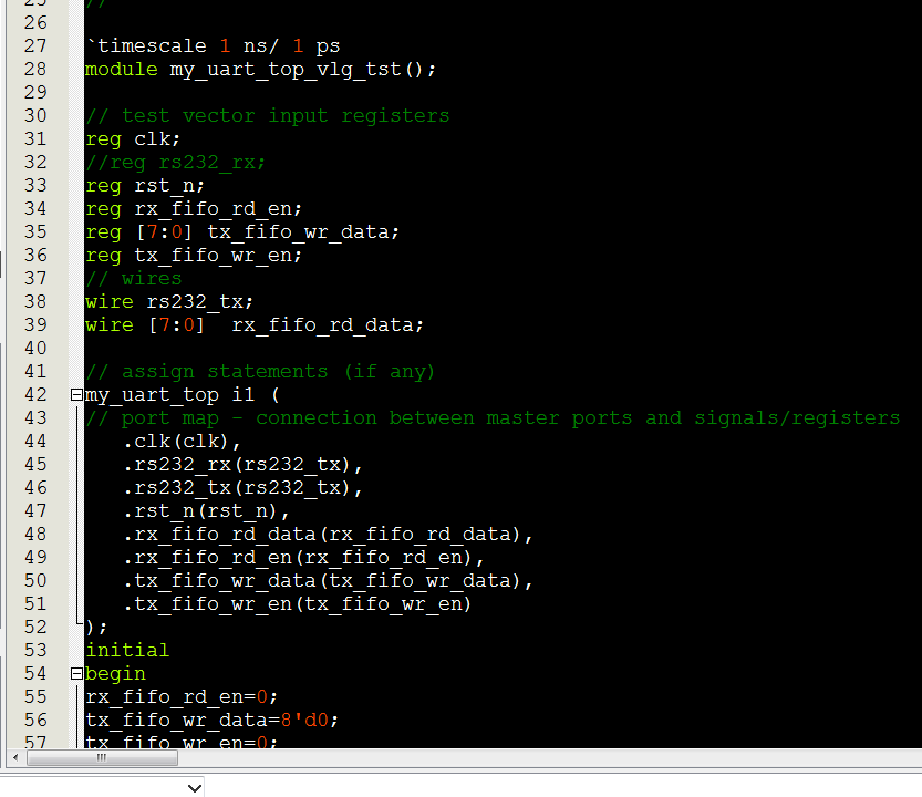 module?my_uart_top(clk,rst_n,rs232_rx,rs232_tx,rx_fifo_rd_en,rx_fifo_rd_data,tx_fifo_wr_en,tx_fifo_wr_data); input?clk;//?50MHz主时钟 input?rst_n;//低电平复位信号 input?rs232_rx;//?RS232接收数据信号 output?rs232_tx;//RS232发送数据信号 input?rx_fifo_rd_en;//fifo读使能 output?[7:0]?rx_fifo_rd_data;//fifo读数据 input?tx_fifo_wr_en;//fifo写使能 input?[7:0]?tx_fifo_wr_data;//fifo写数据 wire?bps_start;//接收到数据后,波特率时钟启动信号置位 wire?clk_bps;//?clk_bps的高电平为接收或者发送数据位的中间采样点? wire[7:0]?rx_data;//接收数据寄存器,保存直至下一个数据来到 wire?rx_en;//接收数据有效 wire[7:0]?rd_data;//接收数据寄存器,保存直至下一个数据来到 wire?rd_en;//接收数据有效 wire?empty; //---------------------------------------------------- //波特率选择模块 speed_selectspeed_select(.clk(clk), .rst_n(rst_n), .clk_bps(clk_bps) ); //接收数据模块 my_uart_rxmy_uart_rx(.clk(clk),//接收数据模块 .rst_n(rst_n), .rs232_rx(rs232_rx), .clk_bps(clk_bps), .rx_data(rx_data), .rx_en(rx_en) );