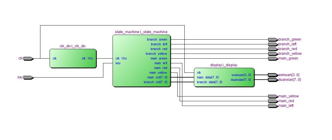LIBRARY?ieee; ???USE?ieee.std_logic_1164.all; --交通灯顶层模块 ENTITY?trafic?IS ???PORT?( ??????clk????????????:?IN?STD_LOGIC;--50M时钟 ??????key????????????:?IN?STD_LOGIC;--紧急按键 ??--主路红绿灯 ??????main_red???????:?OUT?STD_LOGIC; ??????main_green?????:?OUT?STD_LOGIC; ??????main_yellow????:?OUT?STD_LOGIC; ??????main_left??????:?OUT?STD_LOGIC; ?????? --支路红绿灯 ??????branch_red?????:?OUT?STD_LOGIC; ??????branch_green???:?OUT?STD_LOGIC; ??????branch_yellow??:?OUT?STD_LOGIC; ??????branch_left????:?OUT?STD_LOGIC; ?????? ??????weixuan????????:?OUT?STD_LOGIC_VECTOR(3?DOWNTO?0);--数码管位选 ??????duanxian???????:?OUT?STD_LOGIC_VECTOR(7?DOWNTO?0)--数码管段选 ???); END?trafic; ARCHITECTURE?RTL?OF?trafic?IS --模块例化 --状态机控制模块 ???COMPONENT?state_machine?IS ??????PORT?( ?????????clk_1Hz????????:?IN?STD_LOGIC; ?????????key????????????:?IN?STD_LOGIC; ?????????main_red???????:?OUT?STD_LOGIC; ?????????main_green?????:?OUT?STD_LOGIC; ?????????main_yellow????:?OUT?STD_LOGIC; ?????????main_left??????:?OUT?STD_LOGIC; ?????????branch_red?????:?OUT?STD_LOGIC; ?????????branch_green???:?OUT?STD_LOGIC; ?????????branch_yellow??:?OUT?STD_LOGIC; ?????????branch_left????:?OUT?STD_LOGIC; ?????????main_cnt???????:?OUT?STD_LOGIC_VECTOR(7?DOWNTO?0); ?????????branch_cnt?????:?OUT?STD_LOGIC_VECTOR(7?DOWNTO?0) ??????); ???END?COMPONENT; ??? ??--数码管显示模块 ???COMPONENT?display?IS ??????PORT?( ?????????clk????????????:?IN?STD_LOGIC; ?????????main_data??????:?IN?STD_LOGIC_VECTOR(7?DOWNTO?0); ?????????branch_data????:?IN?STD_LOGIC_VECTOR(7?DOWNTO?0); ?????????weixuan????????:?OUT?STD_LOGIC_VECTOR(3?DOWNTO?0); ?????????duanxian???????:?OUT?STD_LOGIC_VECTOR(7?DOWNTO?0) ??????); ???END?COMPONENT; ???--分频模块 ???COMPONENT?clk_div?IS ??????PORT?( ?????????clk????????????:?IN?STD_LOGIC; ?????????clk_1Hz????????:?OUT?STD_LOGIC ??????); ???END?COMPONENT; ???SIGNAL?clk_1Hz?????????????:?STD_LOGIC; ???SIGNAL?main_cnt????????????:?STD_LOGIC_VECTOR(7?DOWNTO?0); ???SIGNAL?branch_cnt??????????:?STD_LOGIC_VECTOR(7?DOWNTO?0); BEGIN --分频模块 ???i_clk_div?:?clk_div ??????PORT?MAP?( ?????????clk??????=>?clk, ?????????clk_1Hz??=>?clk_1Hz--1Hz ??????);