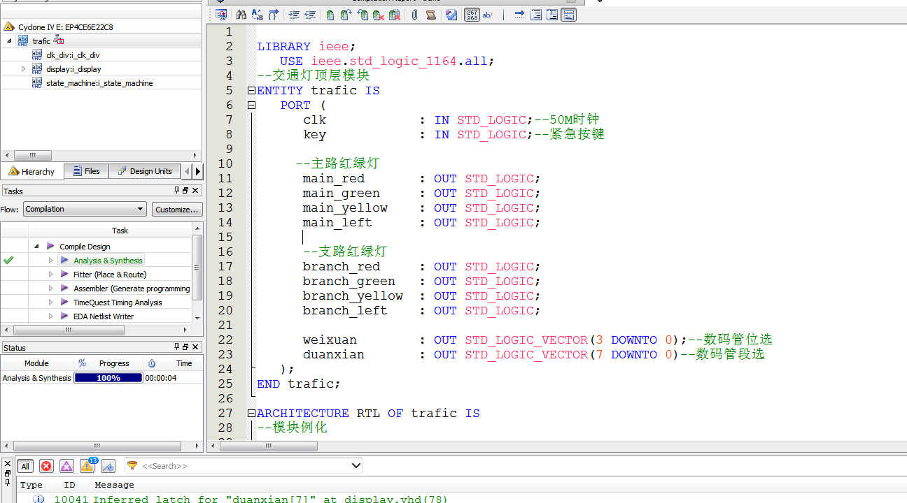 名称:带左转灯的交通灯控制器设计VHDL代码Quartus仿真