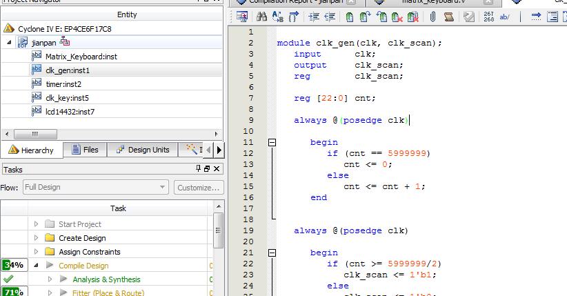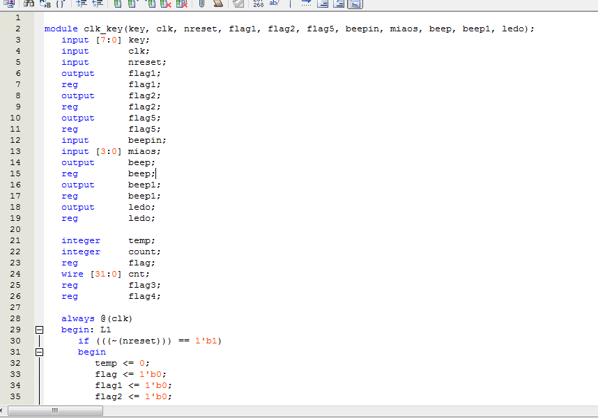 module?clk_gen(clk,?clk_scan); ???input??????clk; ???output?????clk_scan; ???reg????????clk_scan; ??? ???reg?[22:0]?cnt; ??? ???always?@(posedge?clk) ?????? ??????begin ?????????if?(cnt?==?5999999) ????????????cnt?<=?0; ?????????else ????????????cnt?<=?cnt?+?1; ??????end ??? ??? ???always?@(posedge?clk) ?????? ??????begin ?????????if?(cnt?>=?5999999/2) ????????????clk_scan?<=?1'b1; ?????????else ????????????clk_scan?<=?1'b0; ??????end ??? endmodule