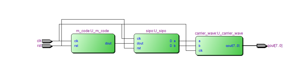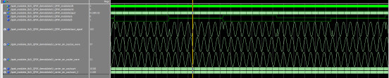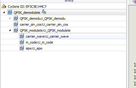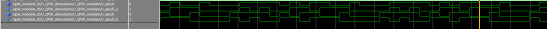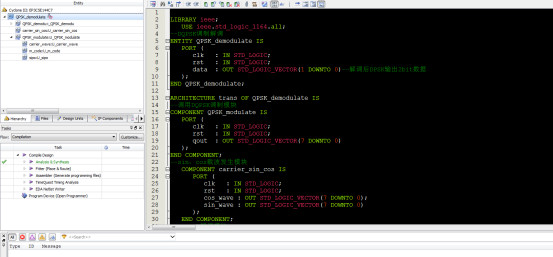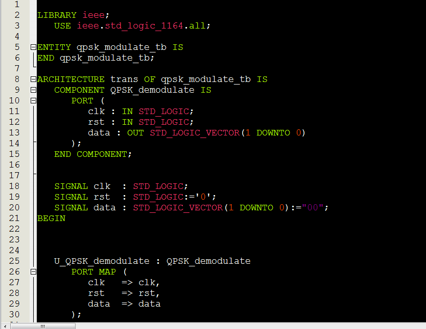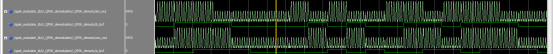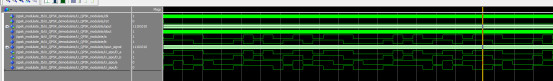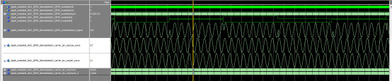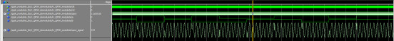 LIBRARY?ieee; ???USE?ieee.std_logic_1164.all; ???USE?ieee.std_logic_unsigned.all; --DPSK解调模块 ENTITY?QPSK_demodu?IS ???PORT?( ??????clk???????:?IN?STD_LOGIC; ??????rst???????:?IN?STD_LOGIC; ??????qout??????:?IN?STD_LOGIC_VECTOR(7?DOWNTO?0);--调制波 ??????cos_wave??:?IN?STD_LOGIC_VECTOR(7?DOWNTO?0);--本地载波 ??????sin_wave??:?IN?STD_LOGIC_VECTOR(7?DOWNTO?0);--本地载波 ??????data??????:?OUT?STD_LOGIC_VECTOR(1?DOWNTO?0)--解调输出 ???); END?QPSK_demodu; ARCHITECTURE?trans?OF?QPSK_demodu?IS ??? ???SIGNAL?cos_mul????????:?STD_LOGIC_VECTOR(15?DOWNTO?0); ???SIGNAL?sin_mul????????:?STD_LOGIC_VECTOR(15?DOWNTO?0); ??? ???SIGNAL?filter_cos_cnt?:?STD_LOGIC_VECTOR(5?DOWNTO?0)?:=?"000000"; ???SIGNAL?filter_sin_cnt?:?STD_LOGIC_VECTOR(5?DOWNTO?0)?:=?"000000"; ???SIGNAL?demodulate_a???:?STD_LOGIC?:=?'0'; ???SIGNAL?demodulate_b???:?STD_LOGIC?:=?'0'; ??? ???SIGNAL?cnt????????????:?STD_LOGIC_VECTOR(7?DOWNTO?0)?:=?"00000000"; ??? ???SIGNAL?a_buf??????????:?STD_LOGIC?:=?'0'; ???SIGNAL?b_buf??????????:?STD_LOGIC?:=?'0'; ???SIGNAL?a_buf2?????????:?STD_LOGIC?:=?'0'; ???SIGNAL?b_buf2?????????:?STD_LOGIC?:=?'0'; ???SIGNAL?D_a????????????:?STD_LOGIC; ???SIGNAL?D_b????????????:?STD_LOGIC; ??? ???SIGNAL?data_buf???????:?STD_LOGIC_VECTOR(1?DOWNTO?0); BEGIN ???cos_mul?<=?(cos_wave?*?qout);--调制波形与本地载波相乘 ???sin_mul?<=?(sin_wave?*?qout);--调制波形与本地载波相乘 ??? --采用计数器滤波,检测到cos_mul(15)?=?'1'后计数到011001 PROCESS?(clk) ???BEGIN ??????IF?(clk'EVENT?AND?clk?=?'1')?THEN ?????????IF?(rst?=?'1')?THEN ????????????filter_cos_cnt?<=?"000000"; ?????????ELSIF?(cos_mul(15)?=?'1')?THEN ????????????filter_cos_cnt?<=?"000001"; ?????????ELSIF?(filter_cos_cnt?=?"000000")?THEN ????????????filter_cos_cnt?<=?"000000"; ?????????ELSIF?(filter_cos_cnt?>=?"011001")?THEN ????????????filter_cos_cnt?<=?"000000"; ?????????ELSE ????????????filter_cos_cnt?<=?filter_cos_cnt?+?"000001"; ?????????END?IF; ??????END?IF; ???END?PROCESS; ??? ???PROCESS?(clk) ???BEGIN ??????IF?(clk'EVENT?AND?clk?=?'1')?THEN ?????????IF?(filter_cos_cnt?=?"000000")?THEN ????????????demodulate_a?<=?'0';--滤波输出解调的a路信号 ?????????ELSE ????????????demodulate_a?<=?'1';--滤波输出解调的a路信号 ?????????END?IF; ??????END?IF; ???END?PROCESS; ??? --采用计数器滤波,检测到sin_mul(15)?=?'1'后计数到011001 ???PROCESS?(clk) ???BEGIN ??????IF?(clk'EVENT?AND?clk?=?'1')?THEN ?????????IF?(rst?=?'1')?THEN ????????????filter_sin_cnt?<=?"000000"; ?????????ELSIF?(sin_mul(15)?=?'1')?THEN ????????????filter_sin_cnt?<=?"000001"; ?????????ELSIF?(filter_sin_cnt?=?"000000")?THEN ????????????filter_sin_cnt?<=?"000000"; ?????????ELSIF?(filter_sin_cnt?>=?"011001")?THEN ????????????filter_sin_cnt?<=?"000000"; ?????????ELSE ????????????filter_sin_cnt?<=?filter_sin_cnt?+?"000001"; ?????????END?IF; ??????END?IF; ???END?PROCESS;