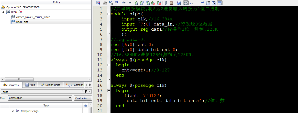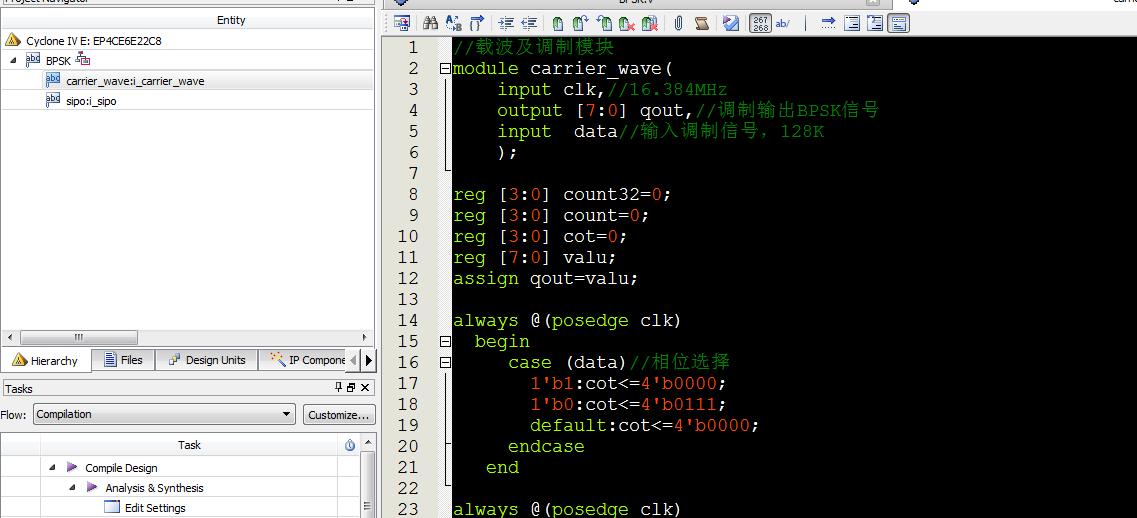 名称:BPSK调制波形产生设计Verilog代码Quartus仿真