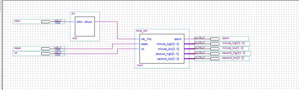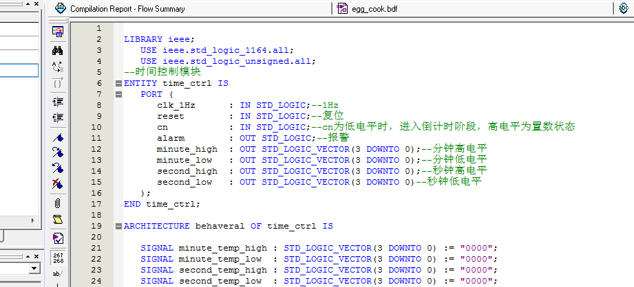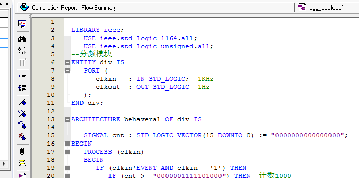 LIBRARY?ieee; ???USE?ieee.std_logic_1164.all; ???USE?ieee.std_logic_unsigned.all; --分频模块 ENTITY?div?IS ???PORT?( ??????clkin???:?IN?STD_LOGIC;--1KHz ??????clkout??:?OUT?STD_LOGIC--1Hz ???); END?div; ARCHITECTURE?behaveral?OF?div?IS ??? ???SIGNAL?cnt?:?STD_LOGIC_VECTOR(15?DOWNTO?0)?:=?"0000000000000000"; BEGIN ???PROCESS?(clkin) ???BEGIN ??????IF?(clkin'EVENT?AND?clkin?=?'1')?THEN ?????????IF?(cnt?>=?"0000001111101000")?THEN--计数1000 ????????????cnt?<=?"0000000000000000"; ?????????ELSE ????????????cnt?<=?cnt?+?"0000000000000001";--计数 ?????????END?IF; ??????END?IF; ???END?PROCESS;