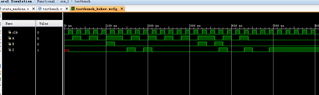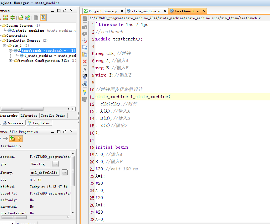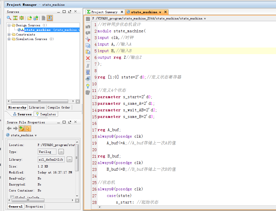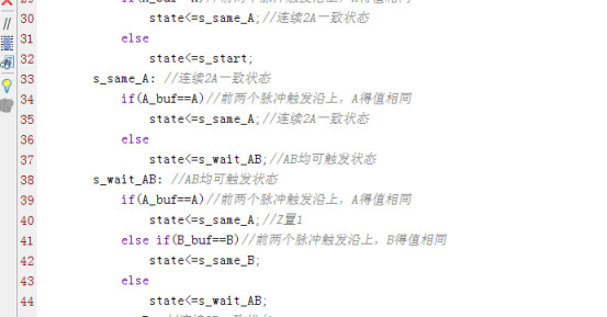 //时钟同步状态机设计 module?state_machine( input?clk,//时钟 input?A,//输入A input?B,//输入B output?reg?Z//输出Z ); reg?[1:0]?state=2'd0;//定义状态寄存器 //定义4个状态 parameter?s_start=2'd0; parameter?s_same_A=2'd1; parameter?s_wait_AB=2'd2; parameter?s_same_B=2'd3; reg?A_buf; always@(posedge?clk) A_buf<=A;//A_buf存储上一次A的值 reg?B_buf; always@(posedge?clk) B_buf<=B;//B_buf存储上一次B的值