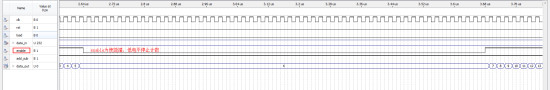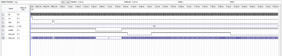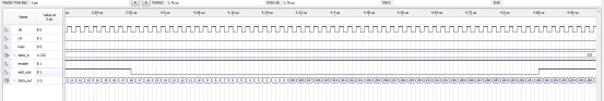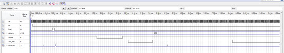 3)单击processing->start simulation 选项,启动仿真器。使用调制焦距工具调整波形坐标间距,异步清零同步置数可逆计数器仿真波形如下图所示: