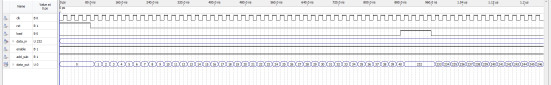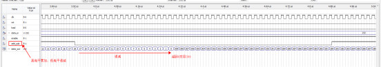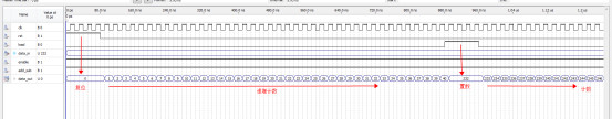 若rst为低电平,则不复位,此时若load为高电平,则为置数功能,此时data_out的输出将等于data_in信号,对应可以看到上面仿真图图3,当load为高电平,输出为232,即data_in信号,因此置数功能仿真验证正确。