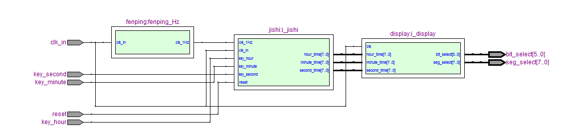 LIBRARY?ieee; ???USE?ieee.std_logic_1164.all; ENTITY?Digital_clock?IS ???PORT?( ??????clk_in?????:?IN?STD_LOGIC;--50MHz ??????reset?????:?IN?STD_LOGIC;--reset ??key_hour???:?IN?STD_LOGIC;--修改小时 ??key_minute?:?IN?STD_LOGIC;--修改分钟 ??key_second?:?IN?STD_LOGIC;--修改miao钟 ??????bit_select?:?OUT?STD_LOGIC_VECTOR(5?DOWNTO?0);--数码管位选 ??????seg_select?:?OUT?STD_LOGIC_VECTOR(7?DOWNTO?0)--数码管段选 ???); END?Digital_clock; ARCHITECTURE?bahave?OF?Digital_clock?IS --模块声明 ???COMPONENT?display?IS ??????PORT?( ?????????clk????????:?IN?STD_LOGIC; ?????????hour_time??:?IN?STD_LOGIC_VECTOR(7?DOWNTO?0); ?????????minute_time?:?IN?STD_LOGIC_VECTOR(7?DOWNTO?0); ?????????second_time?:?IN?STD_LOGIC_VECTOR(7?DOWNTO?0); ?bit_select?????:?OUT?STD_LOGIC_VECTOR(5?DOWNTO?0);--数码管位选 ?seg_select?????:?OUT?STD_LOGIC_VECTOR(7?DOWNTO?0)--数码管段选 ??????); ???END?COMPONENT; ???COMPONENT?fenping?IS ??????PORT?( ?????????clk_in????:?IN?STD_LOGIC; ?????????clk_1Hz????:?OUT?STD_LOGIC ??????); ???END?COMPONENT; ??? ???COMPONENT?jishi?IS ??????PORT?( ?????????clk_in????:?IN?STD_LOGIC; ?????????reset?????:?IN?STD_LOGIC;--reset key_hour???:?IN?STD_LOGIC;--修改小时 key_minute?:?IN?STD_LOGIC;--修改分钟 key_second?:?IN?STD_LOGIC;--修改miao钟 ?????????clk_1Hz????:?IN?STD_LOGIC; ?????????hour_time??:?OUT?STD_LOGIC_VECTOR(7?DOWNTO?0); ?????????minute_time?:?OUT?STD_LOGIC_VECTOR(7?DOWNTO?0); ?????????second_time?:?OUT?STD_LOGIC_VECTOR(7?DOWNTO?0) ??????); ???END?COMPONENT; ??? ???SIGNAL?hour_time?????????:?STD_LOGIC_VECTOR(7?DOWNTO?0); ???SIGNAL?minute_time???????:?STD_LOGIC_VECTOR(7?DOWNTO?0); ???SIGNAL?second_time???????:?STD_LOGIC_VECTOR(7?DOWNTO?0); ???SIGNAL?clk_1Hz???????????:?STD_LOGIC; BEGIN ???--分频到1Hz ???fenping_Hz?:?fenping ??????PORT?MAP?( ?????????clk_in??=>?clk_in, ?????????clk_1Hz??=>?clk_1Hz ??????); ??? ??? ???--计时模块 ???i_jishi?:?jishi ??????PORT?MAP?( ?????????clk_in??????=>?clk_in, ?????????reset???=>reset, ?key_hour=>?key_hour, ?key_minute=>?key_minute, ?key_second?=>?key_second,--修改miao钟 ?????????clk_1Hz??????=>?clk_1Hz, ?????????hour_time????=>?hour_time,--时 ?????????minute_time??=>?minute_time,--分 ?????????second_time??=>?second_time--秒 ??????); ??? ???--显示模块 ???i_display?:?display ??????PORT?MAP?( ?????????clk????????????????=>?clk_in, ?????????hour_time??????????=>?hour_time, ?????????minute_time????????=>?minute_time, ?????????second_time????????=>?second_time, ?bit_select?????=>bit_select,--数码管位选 ?seg_select?????=>seg_select--数码管段选 ??????); ??? END?bahave;