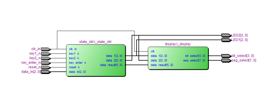 LIBRARY?ieee; ???USE?ieee.std_logic_1164.all; --乘法器 ENTITY?mult?IS ???PORT?( ??????clk_in???????:?IN?STD_LOGIC;--时钟 ??????reset_n??????:?IN?STD_LOGIC;--复位 ??????data_in??????:?IN?STD_LOGIC_VECTOR(2?DOWNTO?0);--输入 ??????key1_n???????:?IN?STD_LOGIC;--按键1 ??????key2_n???????:?IN?STD_LOGIC;--按键2 ??????key_enter_n??:?IN?STD_LOGIC;--等于键 LED1???????:?OUT?STD_LOGIC_VECTOR(2?DOWNTO?0);--数据1 ??????LED2???????:?OUT?STD_LOGIC_VECTOR(2?DOWNTO?0);--数据2 ??????bit_select?????:?OUT?STD_LOGIC_VECTOR(3?DOWNTO?0);--数码管位选 ??????seg_select?????:?OUT?STD_LOGIC_VECTOR(7?DOWNTO?0)--数码管段选 ???); END?mult; ARCHITECTURE?behave?OF?mult?IS --控制模块 ???COMPONENT?state_ctrl?IS ??????PORT?( ?????????clk_in???????:?IN?STD_LOGIC; ?????????reset_n??????:?IN?STD_LOGIC; ?????????data_in??????:?IN?STD_LOGIC_VECTOR(2?DOWNTO?0); ?????????key1_n???????:?IN?STD_LOGIC; ?????????key2_n???????:?IN?STD_LOGIC; ?????????key_enter_n??:?IN?STD_LOGIC; ?????????data_1???????:?OUT?STD_LOGIC_VECTOR(2?DOWNTO?0); ?????????data_2???????:?OUT?STD_LOGIC_VECTOR(2?DOWNTO?0); ?????????data_result??:?OUT?STD_LOGIC_VECTOR(5?DOWNTO?0) ??????); ???END?COMPONENT; ??? --显示模块 COMPONENT?display?IS ???PORT?( ??????clk????????????:?IN?STD_LOGIC; ?????? ??????data_1?????:?IN?STD_LOGIC_VECTOR(2?DOWNTO?0);--乘数1 ??????data_2????:?IN?STD_LOGIC_VECTOR(2?DOWNTO?0);--乘数2 ??????data_result??:?IN?STD_LOGIC_VECTOR(5?DOWNTO?0);--乘积 ?????? ??????bit_select?????:?OUT?STD_LOGIC_VECTOR(3?DOWNTO?0);--数码管位选 ??????seg_select?????:?OUT?STD_LOGIC_VECTOR(7?DOWNTO?0)--数码管段选 ???); END?COMPONENT; ???SIGNAL?data_1???????????:?STD_LOGIC_VECTOR(2?DOWNTO?0); ???SIGNAL?data_2???????????:?STD_LOGIC_VECTOR(2?DOWNTO?0); ???SIGNAL?data_result??????:?STD_LOGIC_VECTOR(5?DOWNTO?0); BEGIN ??? ??? ???--控制模块 ???i_state_ctrl?:?state_ctrl ??????PORT?MAP?( ?????????clk_in???????=>?clk_in, ?????????reset_n??????=>?reset_n, ?????????data_in??????=>?data_in, ?????????key1_n???????=>?key1_n, ?????????key2_n???????=>?key2_n, ?????????key_enter_n??=>?key_enter_n, ?????????data_1???????=>?data_1, ?????????data_2???????=>?data_2, ?????????data_result??=>?data_result ??????); ???--LED指示灯 LED1<=data_1; LED2<=data_2; ??? ???--显示模块 ???i_display?:?display ??????PORT?MAP?( ?????????clk??????????=>?clk_in, ?????????data_1???????=>?data_1, ?????????data_2???????=>?data_2, ?????????data_result??=>?data_result, ?????????bit_select???=>?bit_select, ?????????seg_select???=>?seg_select ??????); ??? END?behave;
