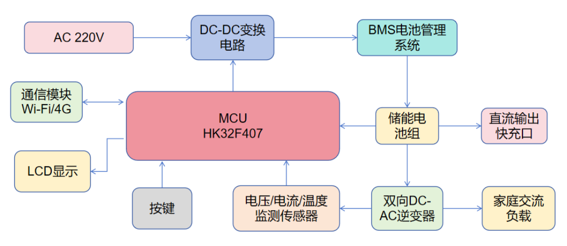 航顺HK32F407家庭移动储能解决方案以高性能的HK32F407芯片为核心,构建了一套完整、高效、可靠的储能系统架构。该方案主要包括以下几个关键部分: