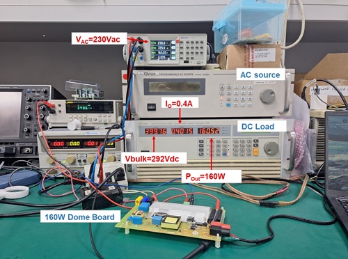 ? ? ? ?本方案使用安森美半导体(Onsemi Semiconductor) NCP1623A CrM PFC控制器直接取代NCP1622做160W前端稳压解决方案,从图二可以看出本方案在低压110Vac输入、负载为0.4安培时,其输出电压为290Vdc。从图三可以看出本方案在高压230Vac输入、负载为0.4安培时,其输出电压为400Vdc。图四为本方案在各不同输入电压与负载时,其效率的表现,从图四可以看出本方案从10%负载到100%负载在各不同输入电压下都可以维持在89% 以上的效率表现。