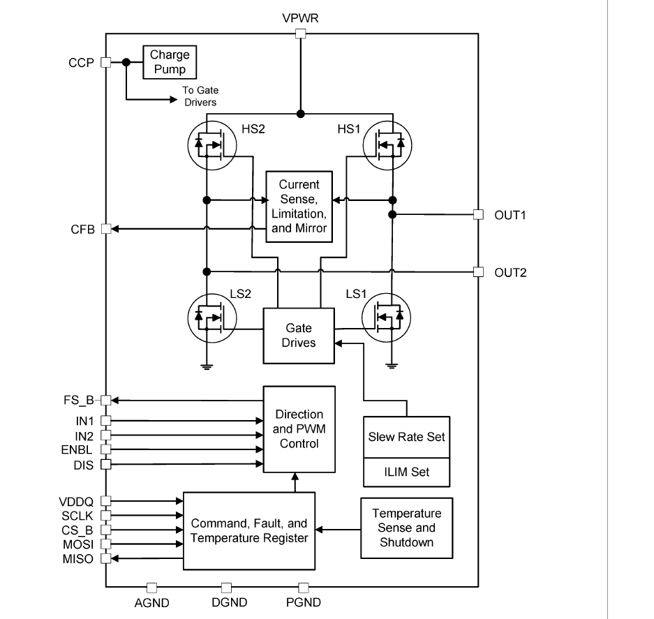 - 通过串行外设接口 (SPI) 进行高级诊断报告:电荷泵欠压、过压、VPWR 欠压、每个输出的接地短路和 VPWR 短路、开路负载、温度警告和过热关断。