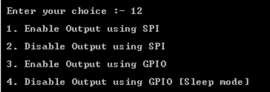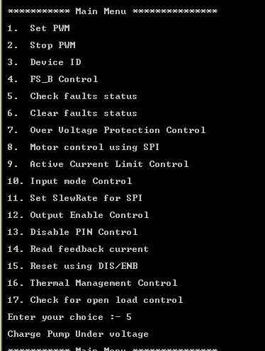 通过按下选项 1,用户可以通过 SPI 启用电机控制。 - 按 #2 禁用过压保护