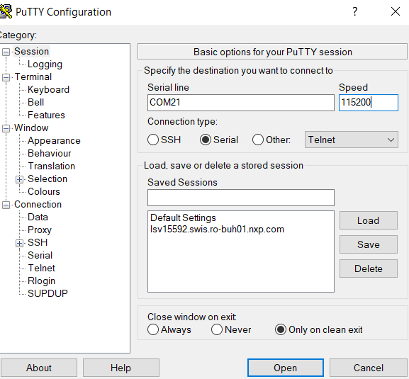 - 打开安装在 Windows PC 上的 PUTTY/Teraterm 应用程序,波特率为 115200,并按照上述步骤分配 COM 端口。