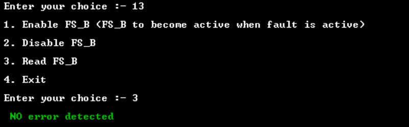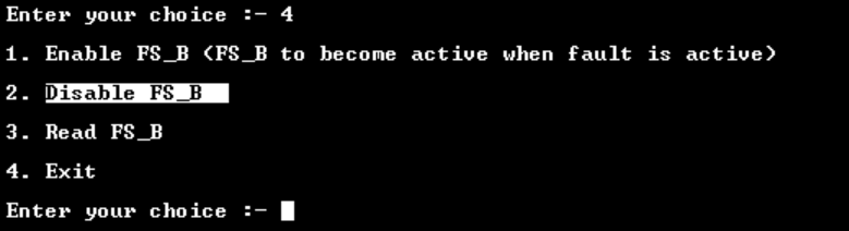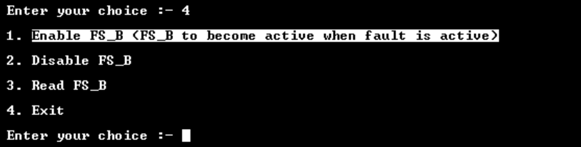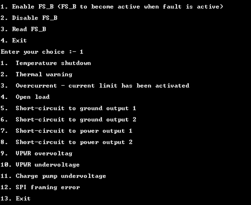 用户可以选择任何可用选项来让 FSB 引脚跟踪所选的故障状态,选项 13 用于退出启用 FS_B 菜单。- 按 #2 禁用 FS_B