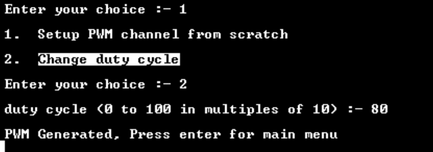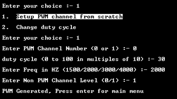 - 通过按下选项 2,用户可以停止 PWM,停止 PWM 后,电机停止。
