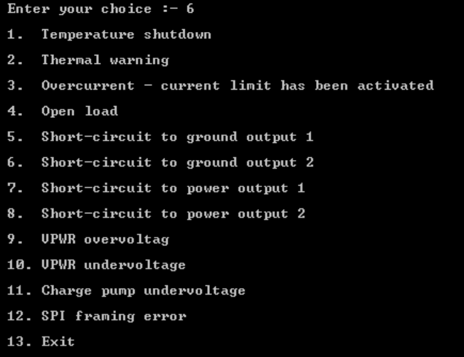 该演示应用程序提供了一个命令行界面,允许用户轻松探索驱动器的不同功能,以使用电机控制器功能,例如使用 PWM 或 SPI 控制电机,使用两种输入模式 H 桥和半桥检查过压、欠压、过流等故障。