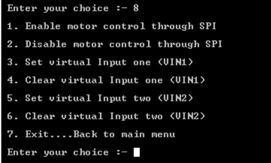通过按下选项 2,用户可以通过 SPI 禁用电机控制。 - 按#3设置虚拟输入一(VIN1)