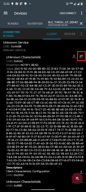 订阅特性 (UUID 0xAABB) 的通知。启用通知并设置 MTU 后,连接的对等体将开始从自定义特性接收定期更新。在串行控制台输出中观察实时帧和吞吐量更新。