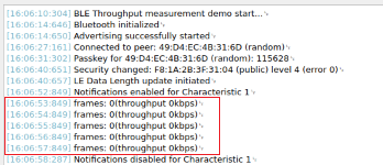 - 通知:订阅自定义特性的 Notify 属性,BLE 扫描器或连接的对等设备将自动接收定期更新。串行控制台中的输出将显示实时帧和吞吐量更新。预期输出如下所示:
