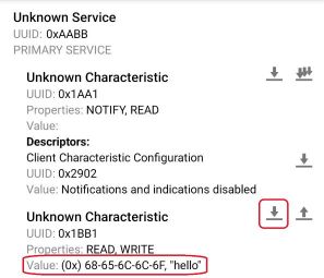 访问可读特性(UUID 0xAABB 或 0xEEFF)并检索其值。值会动态更新,可在应用中查看。