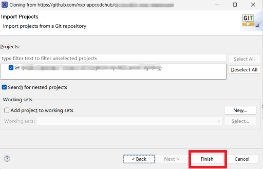 - 选择主分支然后点击Next>,选择MCUXpresso工程,点击Finish按钮完成导入。