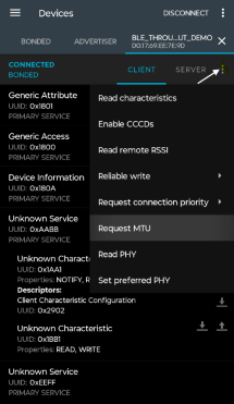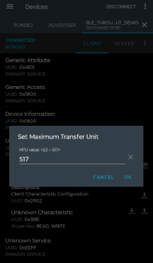 连接后,使用 BLE 扫描仪应用程序发现可用的 GATT 服务及其特性。 - 将 MTU 设置为 517