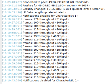 已连接到对等方:49:D4:EC:4B:31:6D(随机) 49:D4:EC:4B:31:6D(随机)的密钥:048657 安全性已更改:F8:1A:2B:3F:31:04(公共)级别 4(错误 0) LE 数据长度更新已启动 已启用特性 1 的通知 帧:171(吞吐量 701kbps) 帧:100(吞吐量 410kbps) 帧:104(吞吐量 426kbps) 帧:117(吞吐量 480kbps)