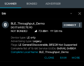 使用兼容 BLE 的设备(Android/iOS)扫描附近的 BLE 外设。选择并连接到已发布的自定义 GATT 服务,或通过名称“BLEThroughputDemo”进行搜索。