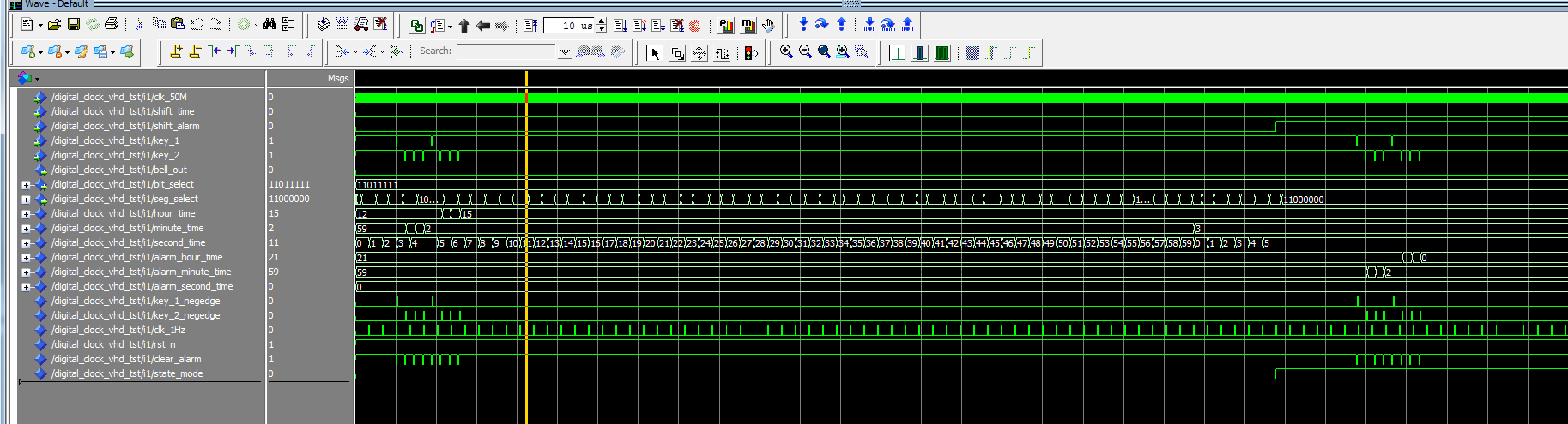 ARCHITECTURE behave OF Digital_clock IS --模块声明 --响铃模块 COMPONENT Bell IS PORT ( clk_50M?????: IN STD_LOGIC; clear_alarm????????????: IN STD_LOGIC;--关闭闹钟键(key3) alarm_hour_time : IN STD_LOGIC_VECTOR(7 DOWNTO 0); alarm_minute_time : IN STD_LOGIC_VECTOR(7 DOWNTO 0); alarm_second_time : IN STD_LOGIC_VECTOR(7 DOWNTO 0); hour_time???: IN STD_LOGIC_VECTOR(7 DOWNTO 0); minute_time : IN STD_LOGIC_VECTOR(7 DOWNTO 0); second_time : IN STD_LOGIC_VECTOR(7 DOWNTO 0); bell_out????: OUT STD_LOGIC ); END COMPONENT; --闹钟模块 COMPONENT alarm_clock IS PORT ( clk_50M????????????: IN STD_LOGIC; rst_n??????????????: IN STD_LOGIC; state_mode????????: IN STD_LOGIC;--当前模式,0:计时,1:闹钟 key_1_neg???????: IN STD_LOGIC;--修改选择(时分) key_2_neg???????: IN STD_LOGIC;--修改时间 alarm_hour_time????: OUT STD_LOGIC_VECTOR(7 DOWNTO 0);--时 alarm_minute_time??: OUT STD_LOGIC_VECTOR(7 DOWNTO 0);--分 alarm_second_time??: OUT STD_LOGIC_VECTOR(7 DOWNTO 0)--秒 ); END COMPONENT; --显示模块 COMPONENT display IS PORT ( clk?????????: IN STD_LOGIC; state_mode??: IN STD_LOGIC; shift_time??: IN STD_LOGIC;--切换开关12/24进制 alarm_hour_time : IN STD_LOGIC_VECTOR(7 DOWNTO 0); alarm_minute_time : IN STD_LOGIC_VECTOR(7 DOWNTO 0); alarm_second_time : IN STD_LOGIC_VECTOR(7 DOWNTO 0); hour_time???: IN STD_LOGIC_VECTOR(7 DOWNTO 0); minute_time : IN STD_LOGIC_VECTOR(7 DOWNTO 0); second_time : IN STD_LOGIC_VECTOR(7 DOWNTO 0); bit_select??: OUT STD_LOGIC_VECTOR(7 DOWNTO 0); seg_select??: OUT STD_LOGIC_VECTOR(7 DOWNTO 0) ); END COMPONENT; --分频模块 COMPONENT fenping IS PORT ( clk_50M?????: IN STD_LOGIC; clk_1Hz?????: OUT STD_LOGIC ); END COMPONENT; --按键消抖 COMPONENT key_jitter IS PORT ( clkin???????: IN STD_LOGIC; key_in??????: IN STD_LOGIC; key_negedge : OUT STD_LOGIC ); END COMPONENT; --计时模块 COMPONENT jishi IS PORT ( clk_50M???????????: IN STD_LOGIC; rst_n?????????????: IN STD_LOGIC; clk_1Hz???????????: IN STD_LOGIC; state_mode????????: IN STD_LOGIC;--当前模式,0:计时,1:闹钟 key_1_neg???????: IN STD_LOGIC;--修改选择(时分) key_2_neg???????: IN STD_LOGIC;--修改时间 hour_time?????????: OUT STD_LOGIC_VECTOR(7 DOWNTO 0);--时 minute_time???????: OUT STD_LOGIC_VECTOR(7 DOWNTO 0);--分 second_time???????: OUT STD_LOGIC_VECTOR(7 DOWNTO 0)--秒 ); END COMPONENT; SIGNAL hour_time?????????????: STD_LOGIC_VECTOR(7 DOWNTO 0);--时 SIGNAL minute_time???????????: STD_LOGIC_VECTOR(7 DOWNTO 0);--分 SIGNAL second_time???????????: STD_LOGIC_VECTOR(7 DOWNTO 0);--秒 SIGNAL alarm_hour_time???????: STD_LOGIC_VECTOR(7 DOWNTO 0);--闹钟时 SIGNAL alarm_minute_time?????: STD_LOGIC_VECTOR(7 DOWNTO 0);--闹钟分 ```