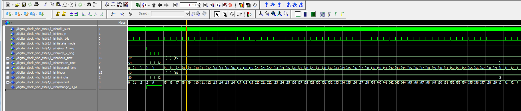 ENTITY Digital_clock IS PORT ( clk_50M?????: IN STD_LOGIC; shift_time???: IN STD_LOGIC;--切换开关12/24进制 shift_alarm??: IN STD_LOGIC;--切换计时还是闹钟 key_1???????: IN STD_LOGIC;--修改选择(时分) key_2???????: IN STD_LOGIC;--修改时间 bell_out????: OUT STD_LOGIC; bit_select??: OUT STD_LOGIC_VECTOR(7 DOWNTO 0);--数码管位选 seg_select??: OUT STD_LOGIC_VECTOR(7 DOWNTO 0)--数码管段选 ); END Digital_clock;