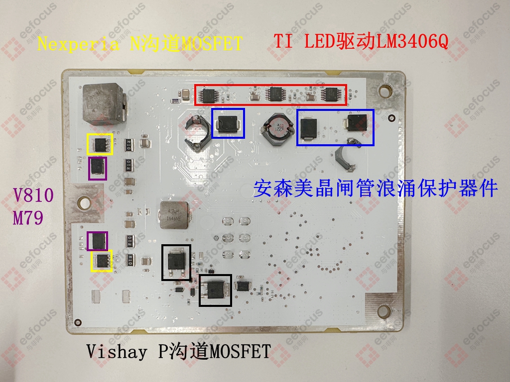 2颗安世半导体N沟道MOSFET BUK9Y19-75B;MOSFET管旁边这两颗应该是分立器件,丝印为(V810 M79),有知道具体型号的小伙伴吗?