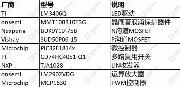 特斯拉Model S大灯驱动模块上主要涉及到的芯片如下表,从硬件方案来看,甚至都没有自适应前照灯系统,确实要比现在的Model 3更简单一些,也更古董一些。