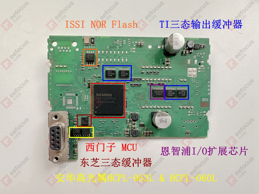 MCU旁边有4颗德州仪器的SN74AHC541缓冲器,具有三态输出的8通道、2V至5.5V缓冲器。主要应该用于增强MCU引脚的驱动能力,同时也提供一定的逻辑隔离作用。这个系列的产品兼容TTL电平的,速度较快,驱动能力强,三态输出??是关键,允许多个设备共享总线(数据总线、地址总线、控制信号)。用了多个器件说明主控板需要驱动的信号线很多。