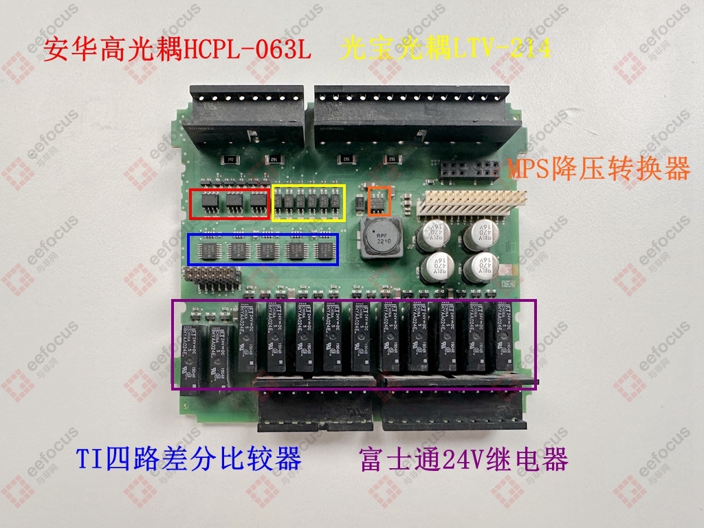 看完主控板上面的芯片选型,接着来看下接口板上的一些器件。那从布局来看,上面是输入,下面是输出,从下面一排器件可以大致知道是继电器输出,那具体来都用了哪些芯片。