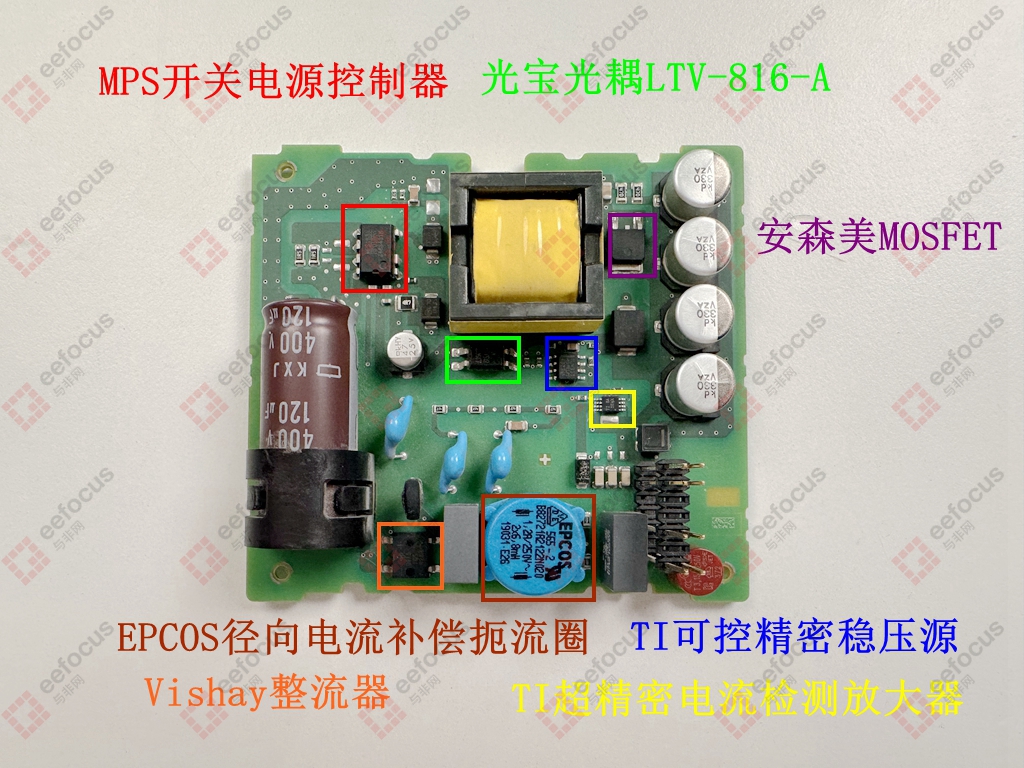 输入端(也就是一次侧)有保险丝、热敏电阻、安规电容、Y电容、径向电流补偿扼流圈、整流器、一个用于整流后滤波的超大个铝电解电容、MOSFET、PWM控制器等。