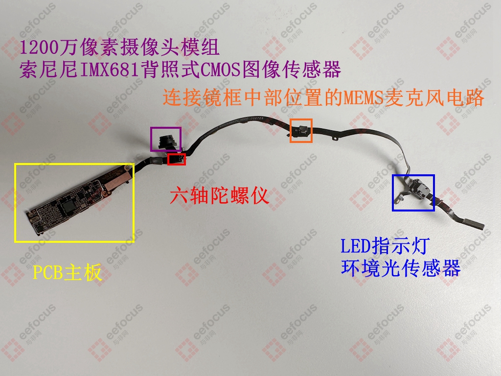 摄像头位置在镜框正面左镜腿侧,而在镜框正面右镜腿侧则是拍照提示灯以及环境光传感器。摄像头模组基于索尼IMX681背照式CMOS图像传感器,1200万像素,支持4K照片拍摄,其中镜头用了5P光学镜头,支持16mm的超广角,在摄像头底部电路板上还有一颗六轴陀螺仪,用于防抖。