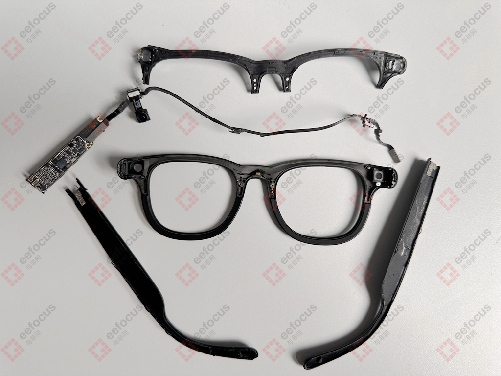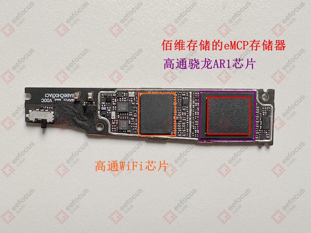 旁边的芯片是高通的WiFi芯片WCN7851,支持WiFi6,在前端电路上有两颗射频模拟前端以及一些滤波器构成的天线电路,天线采用的是FPC柔性天线贴合在镜腿内部,重量轻,适合这种有轻量级需求的可穿戴设备。