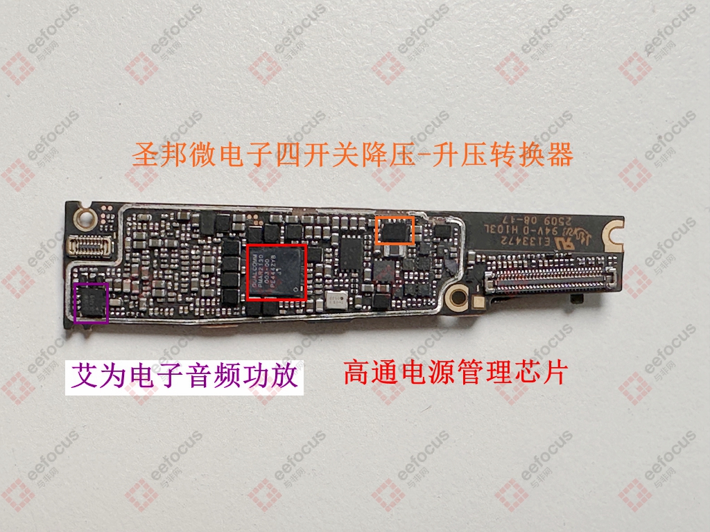 PCB板背面区域基本上是电源电路,中间为高通的电源管理芯片PMAR2130,外围配备多颗一体成型功率电感。旁边都是一些小的电源芯片,比如DC/DC以及LDO等,大多数芯片基本没法直接查到具体型号,不过这里有颗62110的是圣邦微电子的四开关降压-升压转换器,具体型号是SGM62110S,配备了可编程 I2C 接口,非常适合像这类电池供电的应用。